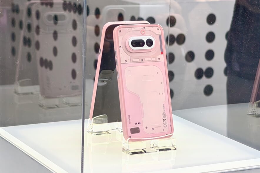 バルセロナで開催中のMWC2026のホール3とホール5の間にある中庭の特設会場にて、3月5日に正式発表予定のNothing Phone (4a)がショーケース越しにではあるがお披露目された。カラーについて正式な名称は明らかにされなかったが、黒・白・ピンク・青の4色が展示された。